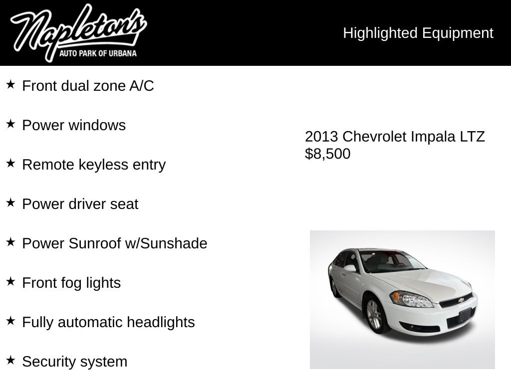 This 2013 Chevrolet Impala LTZ is a true standout in its class, offering a captivating blend of style, comfort, and performance. Experience the difference for yourself by scheduling a test drive today. We're confident that once you take this Impala for a spin, you'll be eager to make it your own.