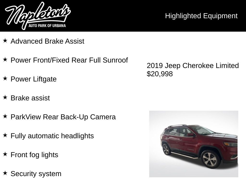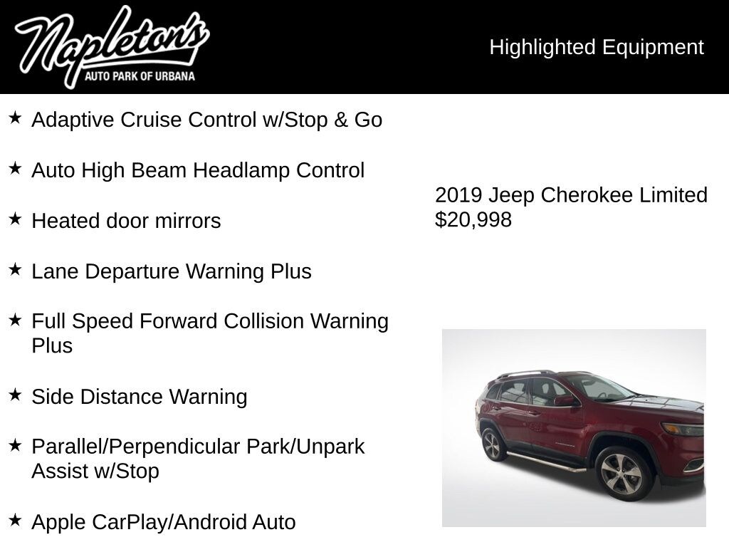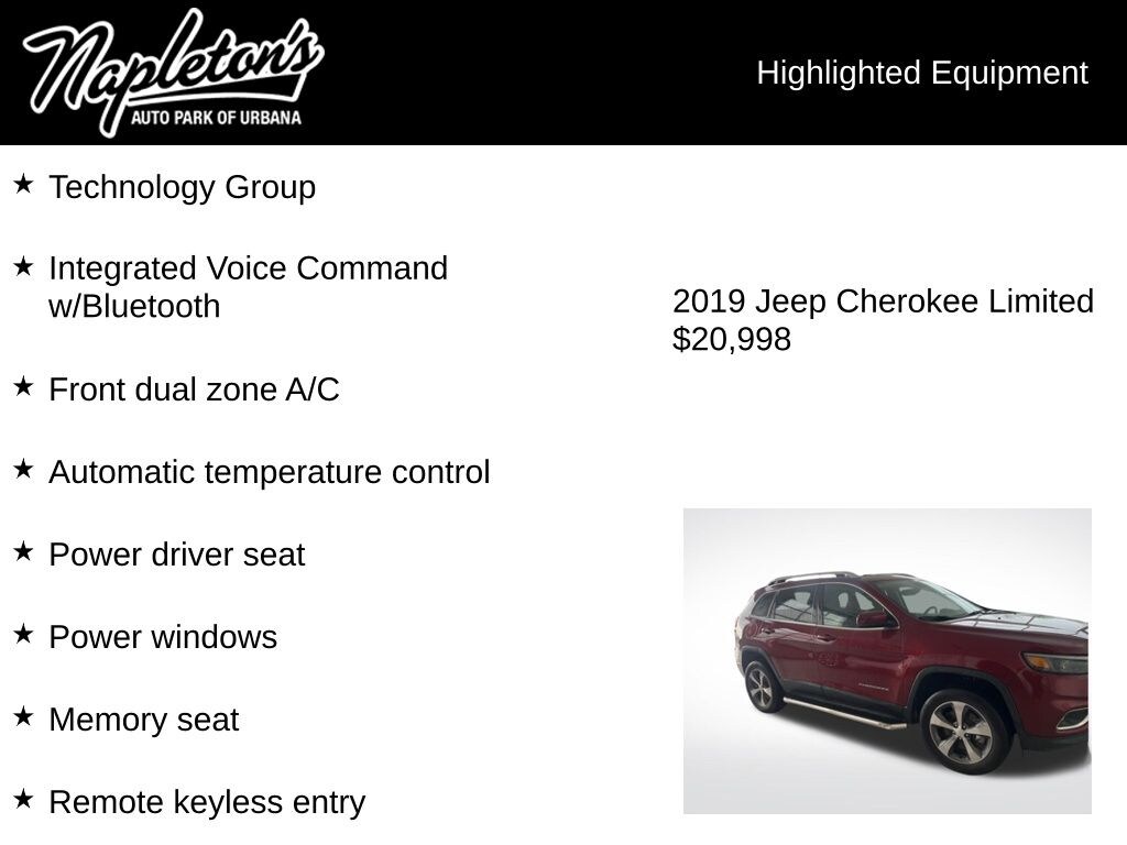 Experience the pinnacle of modern SUV design and capability with this stunning 2019 Jeep Cherokee Limited w/ Technology Group. Boasting a powerful 2.0L I4 DOHC turbocharged engine paired with a smooth-shifting 9-speed automatic transmission, this Cherokee delivers an exceptional blend of performance and efficiency, with an impressive 20 city/29 highway MPG.