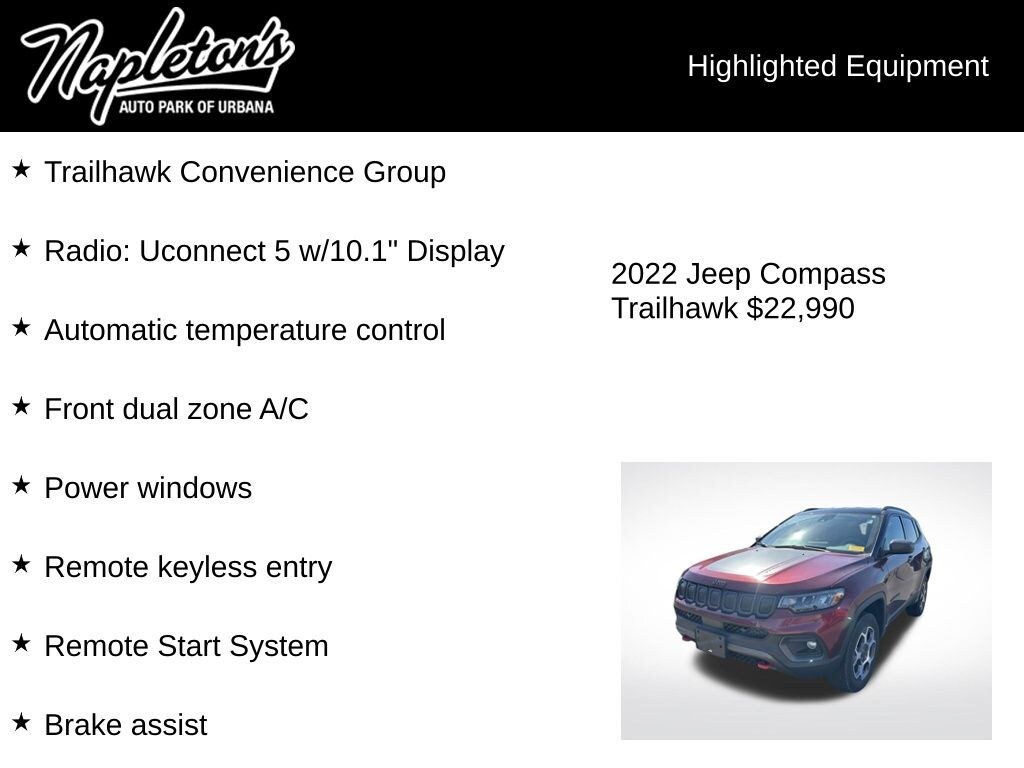 Step into the driver's seat of this 2022 Jeep Compass Trailhawk Convenience Group, and experience the perfect blend of rugged capability and modern convenience. With its striking Velvet Red Pearlcoat exterior and a wealth of premium features, this Compass is sure to turn heads and leave a lasting impression.