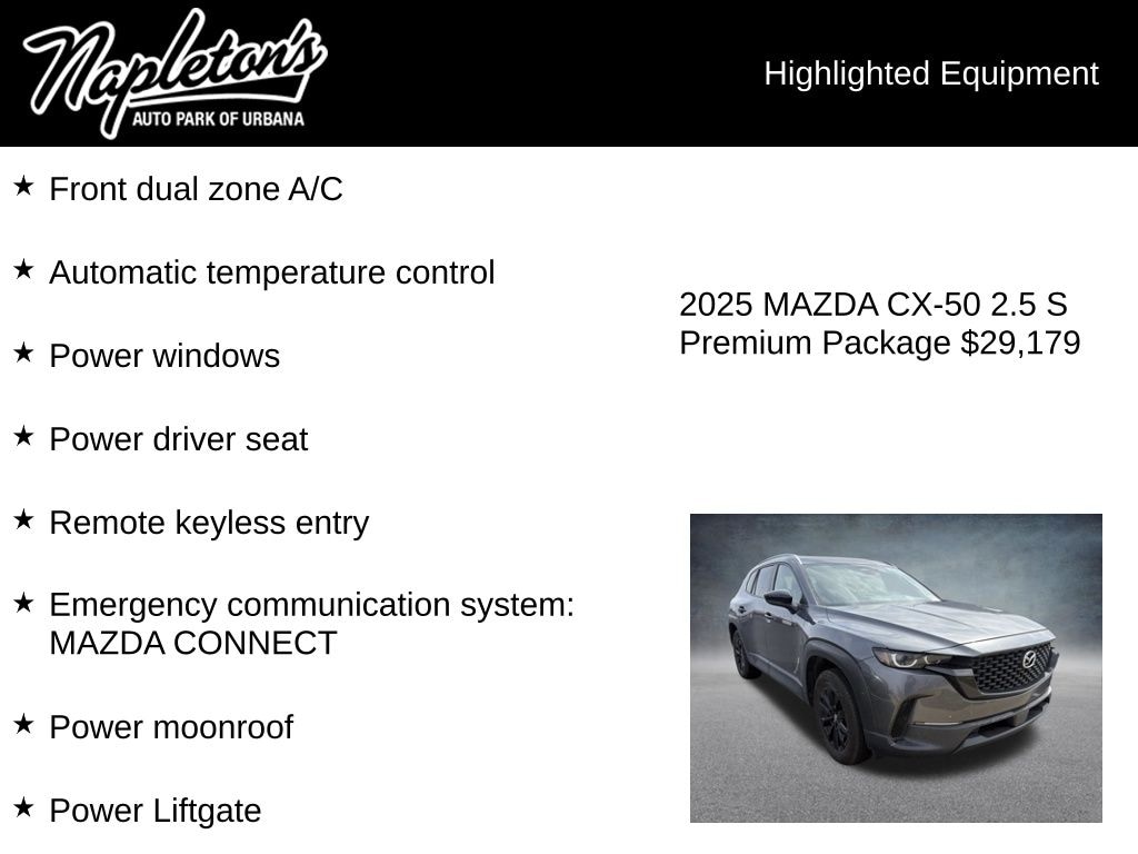 Whether you're embarking on a family road trip or tackling your daily commute, the 2025 Mazda CX-50 2.5 S Premium Package is the perfect companion. Experience the perfect blend of style, performance, and technology by scheduling a test drive at our dealership today. We're confident that this exceptional SUV will exceed your expectations and become an indispensable part of your lifestyle.